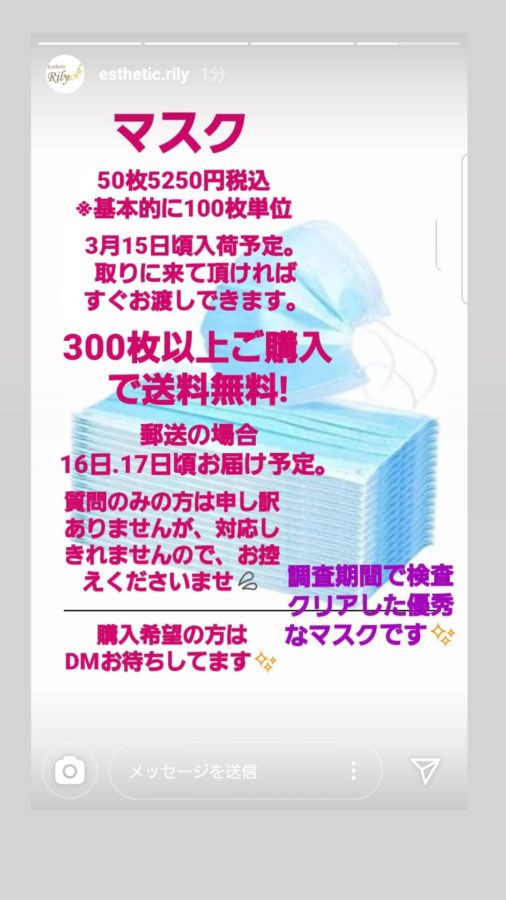 脱毛キャンペーンやってみたり、ブラックボードに電気つけて照らしてみたり、今回、皆様がほんとに必要な物って何って考えて、マスクを仕入れてみて、私たちの利益はないですが困ってる方たちのお力になれたら良いと思っております。